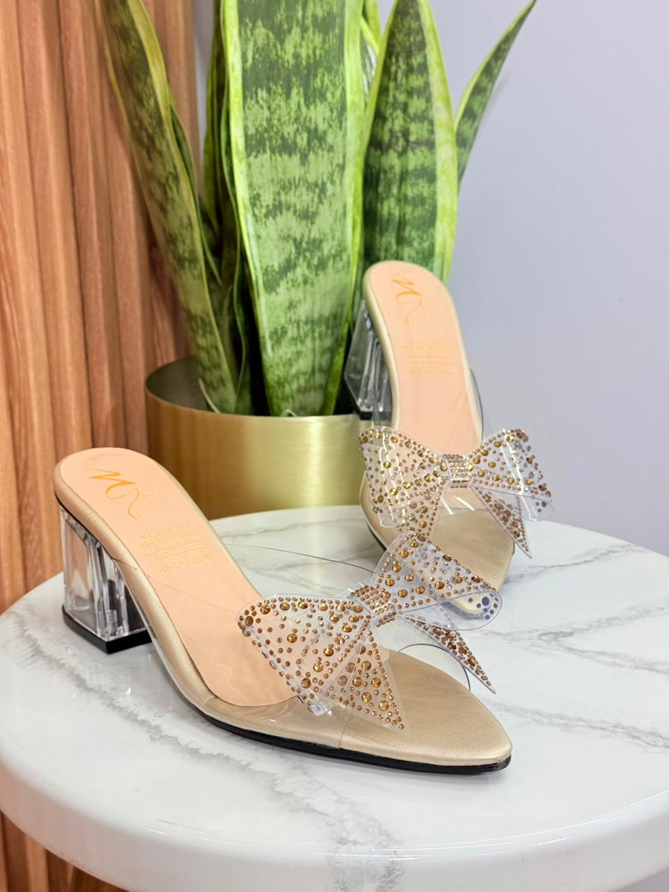 Diseñada para la mujer que busca destacar con distinción, esta sandalia fusiona la tendencia del vinilo transparente con la delicadeza artesanal de un lazo recubierto en pedrería fina. Su estructura equilibra una estética de lujo con una funcionalidad pensada para el uso prolongado, ofreciendo una pisada firme gracias a su tacón en bloque acrílico que proporciona estabilidad sin perder la ligereza visual.